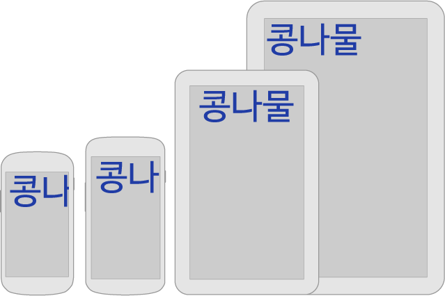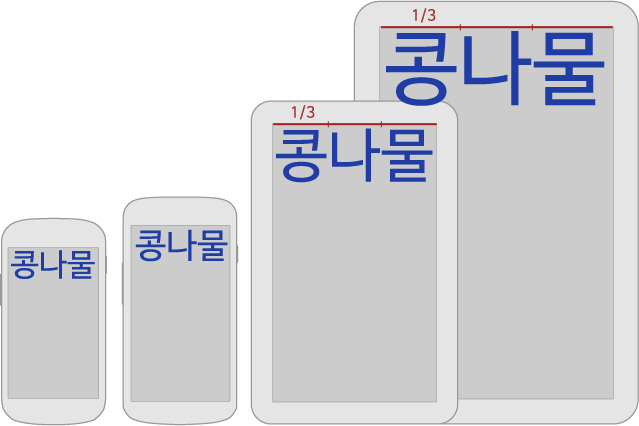 상단의 그림과 같이 화면 크기의 1/3을 차지하는 text사이즈라면, 어떤 기기에서도 text가 화면크기의 1/3를 차지하는 사이즈로 변환됩니다.