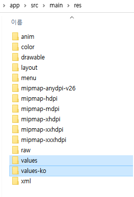 뒤에 언어가 붙지 않은 폴더가 기본 폴더가 되며, 언어에 따라 해당 언어 코드가 붙은 폴더내의 리소스들이 사용되게 됩니다.