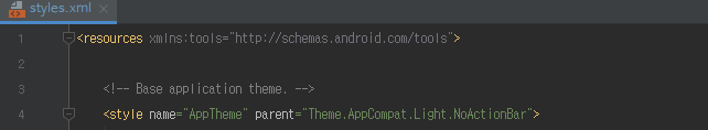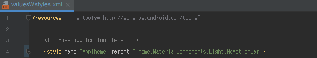 3. 해결방법은 아래와 같이 AppTheme를 MaterialComponents로 변경하면 MaterialComponents들을 사용할 수 있습니다.