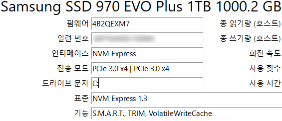 CrystalDisk Info로 확인해보니 아래와 같은 내용을 확인할 수 있었습니다.