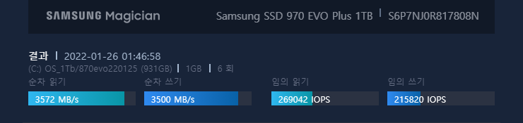 보통은 CrystalDisk Mark를 많이 사용하는데, 삼성 SSD 매지션이 테스트를 지원하기 때문에
